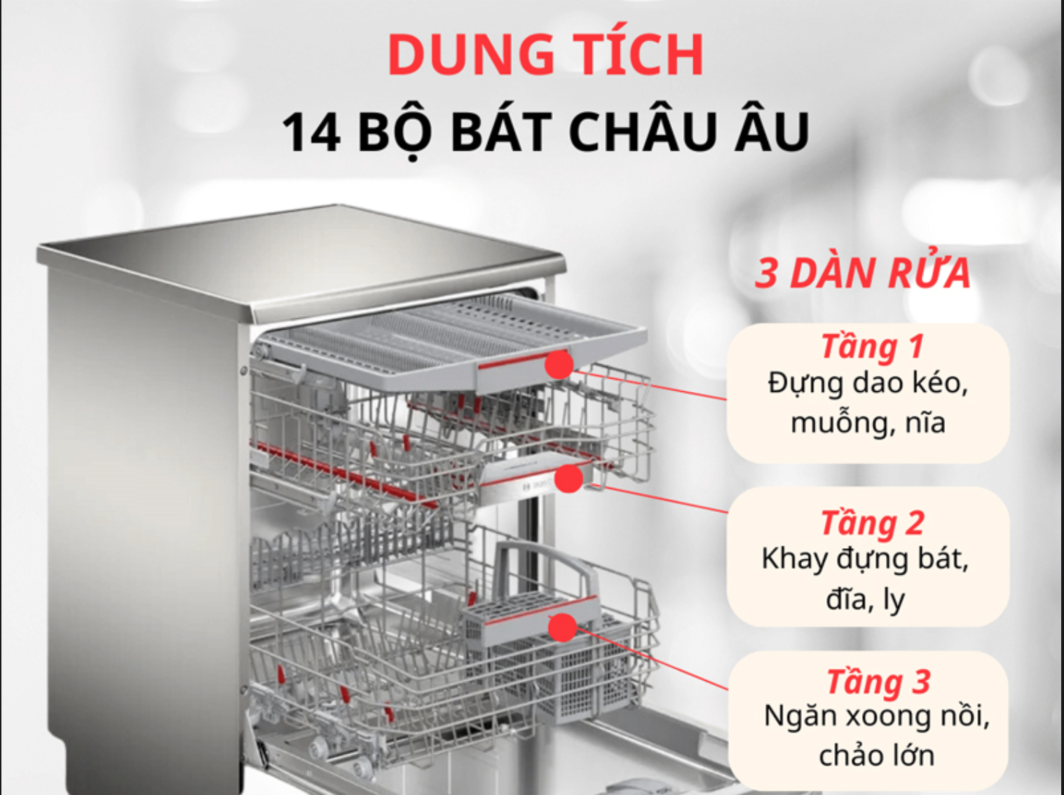Nhờ thiết kế thông minh, máy có thể rửa lượng chén bát tương đương 3–4 bữa ăn gia đình Việt.