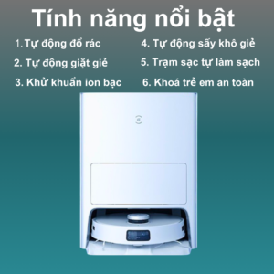 Đi kèm với robot hút bụi lau nhà T10 OMNI là trạm sạc gọn nhẹ, tinh tế. Dock sạc được tích hợp toàn năng 6 trong 1 bao gồm: tự động hút rác, tự động giặt giẻ ngược, sấy khô giẻ bằng khí nóng, khử khuẩn bằng ion bạc, tự làm sạch và khóa trẻ em an toàn.