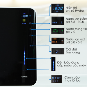 Màn hình cảm ứng LCD hiển thị đầy đủ thông tin về độ pH, nồng độ hydro hoà tan và chế độ hoạt động của máy, giúp người dùng dễ dàng theo dõi và điều chỉnh, chỉ cần chạm nhẹ là có thể chọn được loại nước tương ứng với nhu cầu.